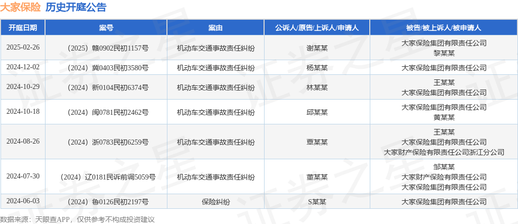 本站消息,根据天眼查APP显示,近日公布了一则大家保险集团有限责任公司作为被告/被上诉人的开庭公告,详细内容如下: